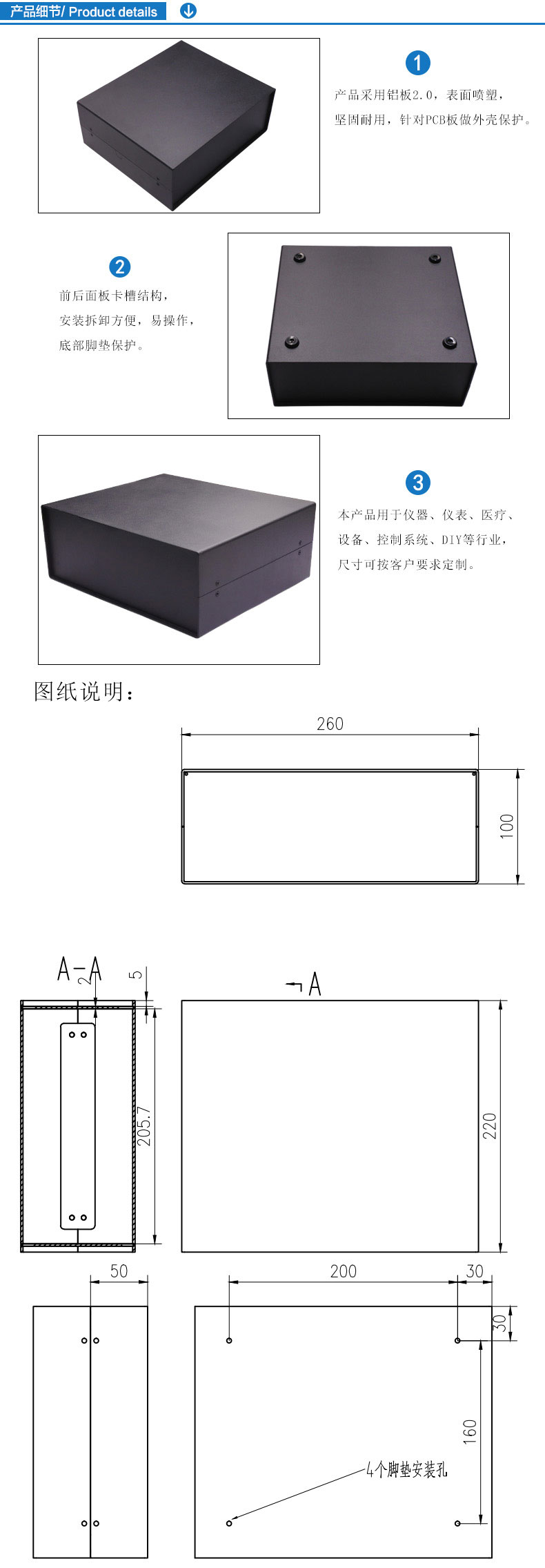 ? ? 1.產(chǎn)品采用鋁板2.0,表面噴塑,堅(jiān)固耐用,針對PCB板做外殼保護(hù)。
